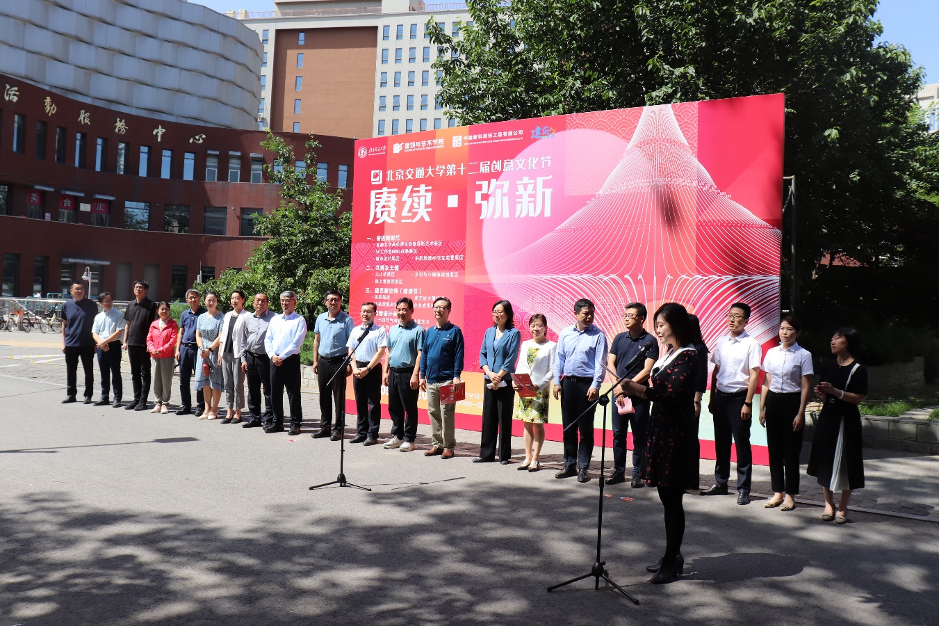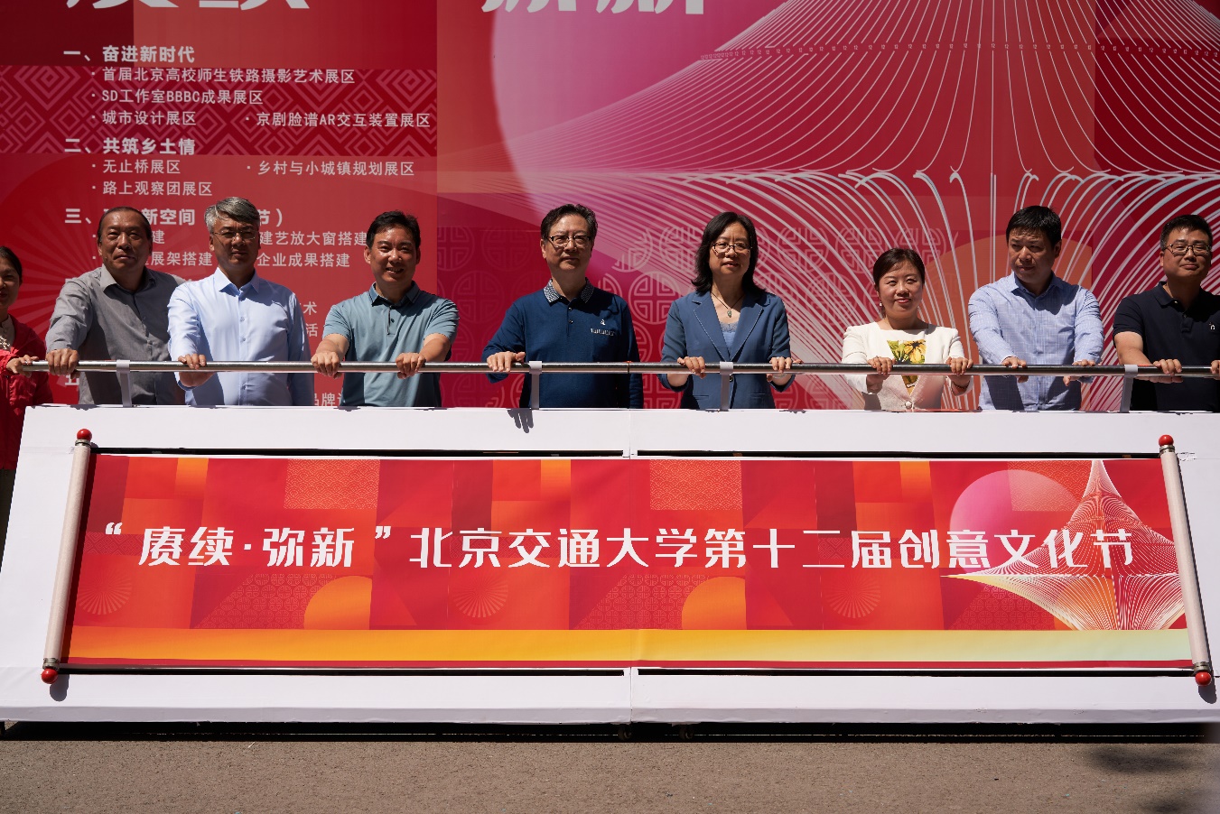 初夏的校园阳光和煦、绿树成荫。5月23日上午,主题为“赓续·弥新”的北京交通大学第十二届创意文化节开幕式在cq9电子游戏试玩网站 伞亭广场精彩开幕。校党委副书记文海涛,中国铁路摄影家协会副主席兼秘书长王博轩,中国铁道博物馆党委副书记、工会主席刘恒,《铁道知识》杂志社原社长、主编魏宗燕,中建新科装饰工程有限公司党总支副书记罗阳等,北京京诚集团有限责任公司副总经理王永久等,密云区溪翁庄镇市民活动中心主任季新等,学校党委宣传部、学工部、研工部、团委、后勤集团、保卫处、外联处、就业与创业指导中心等相关单位负责人,cq9电子游戏试玩网站 师生代表共同参加开幕式。