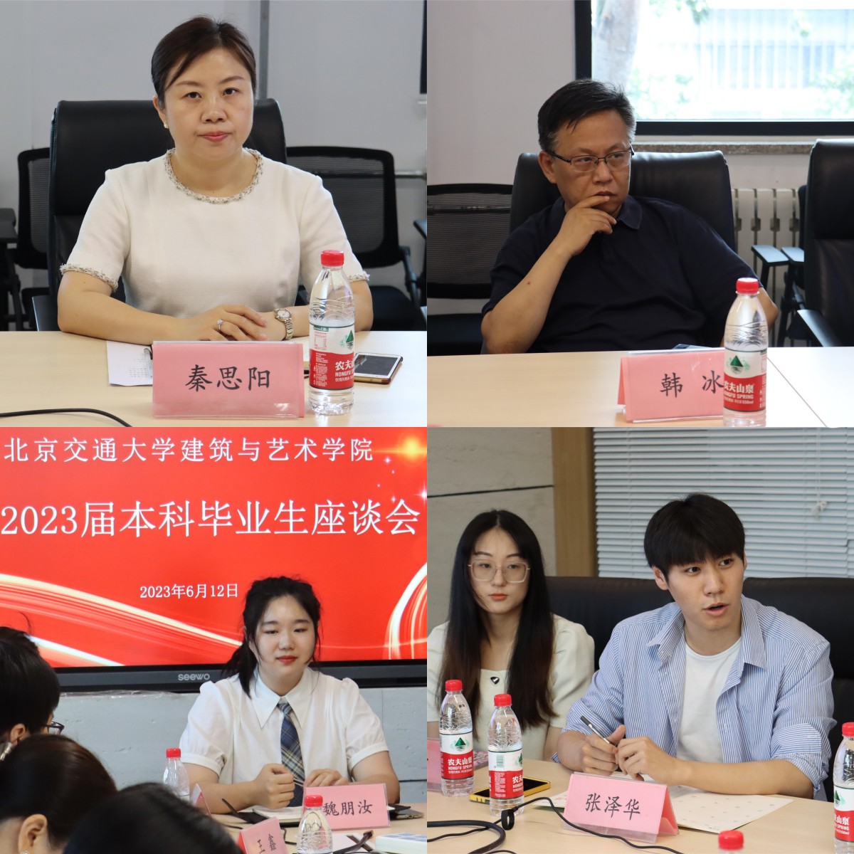 2023年6月12日上午,cq9电子游戏试玩网站 在cq9试玩 三层会议室分两场举行2023届本研毕业生座谈会。cq9试玩 党委书记秦思阳、院长韩冰、党委副书记刘萍、副院长佘高红、副院长张野、建筑系主任盛强、规划系主任王鑫、设计系主任王征、学工办主任张京、毕业生辅导员张帅、董博宇以及本研毕业生代表参加分别参加两场座谈会。