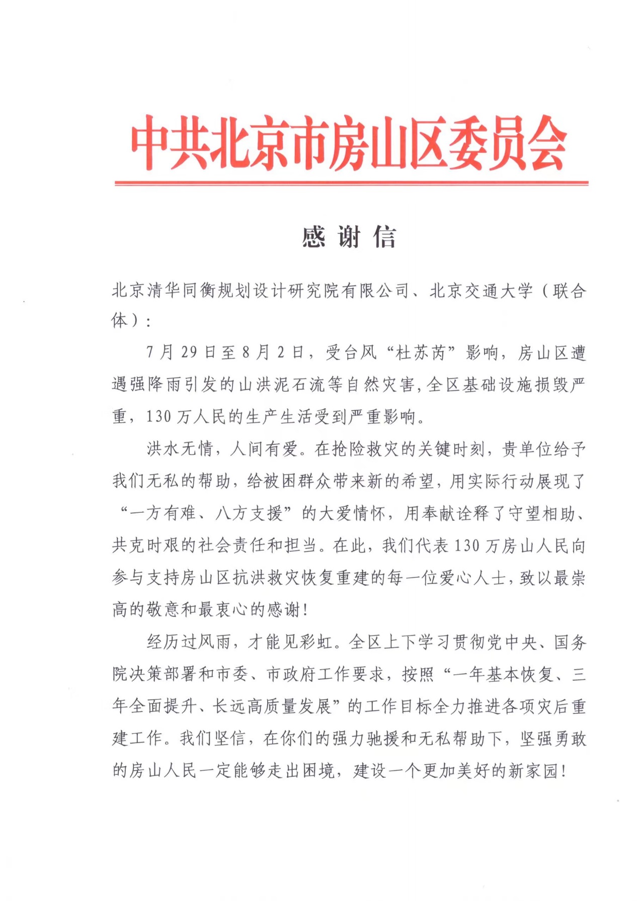 北京市房山区委区政府在感谢信中提到,7月29日至8月2日,房山区遭遇强降雨引发的山洪泥石流等自然灾害,在抢险救灾的关键时刻,我校给予房山区无私的帮助,用实际行动展现了大爱情怀,用奉献诠释了高校的社会责任和担当。房山区灾后重建工作由cq9电子游戏试玩网站 副院长佘高红,城乡规划系主任王鑫,副主任张纯,朱高儒、徐凌玉、徐高峰、张威涛等多位教师组建师生团队参与。