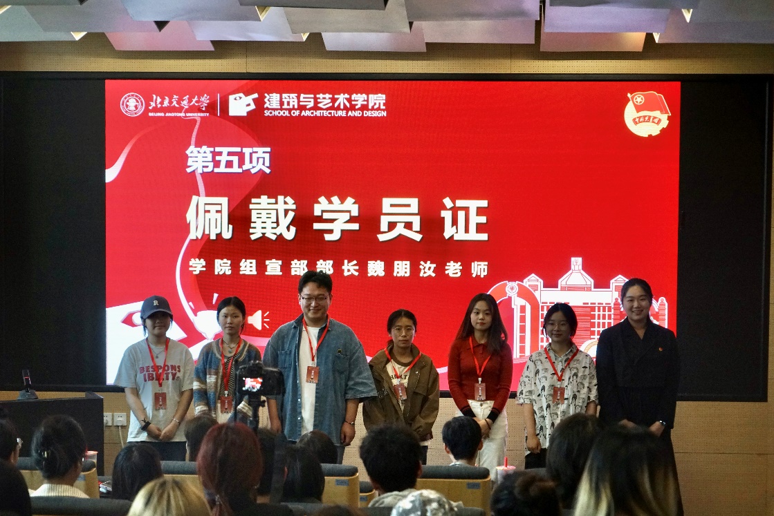 cq9试玩 组宣部部长、本科生辅导员魏朋汝为第四届“瞭望者”计划学生骨干培训代表佩戴学员证。学员证由建艺学生自主设计,以朝气蓬勃,温暖洋溢的橘红色为背景,下方的人物用一双望远镜向远方眺望,象征着朝气昂扬的建艺学子,在充满挑战与希望的未来勇担重任,为实现中华民族的伟大复兴而奋斗。