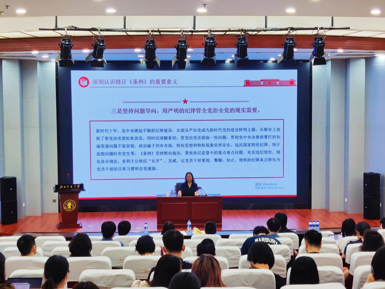于亚光以“知敬畏、存戒惧、守底线——学习《中国共产党纪律处分条例》”为题,从“深刻认识修订《条例》的重要意义”“《条例》新增修改的主要内容”“六项纪律‘负面清单’”“违反纪律典型案例”四个方面进行了详细讲解,主题鲜明,深入浅出,结合自身工作经验,将《条例》联系到高校工作实际,用身边事教育身边人,以案促学,以案促思,加深了全体党员对《条例》的理解、对党纪的认知。通过学习,cq9试玩 党员进一步强化了法纪意识、底线意识,增强了政治定力、纪律定力、道德定力、抵腐定力,决心把遵规守纪刻印在心,内化为言行准则,切实把党纪学习教育的实际成效转化为推动cq9试玩 事业发展的生动实践。