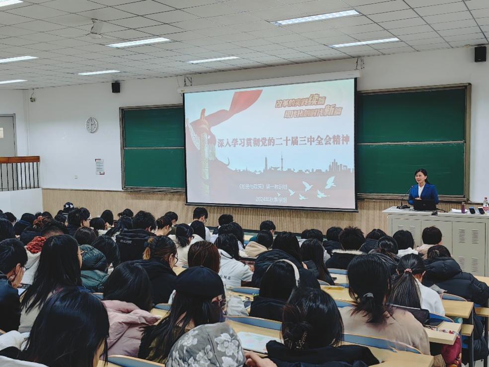 2024年12月19日下午,校党委副书记、纪委书记王文文在九教中102为cq9电子游戏试玩网站 2023、2024级本科生讲授形势与政策课《深入学习贯彻党的二十届三中全会精神》。