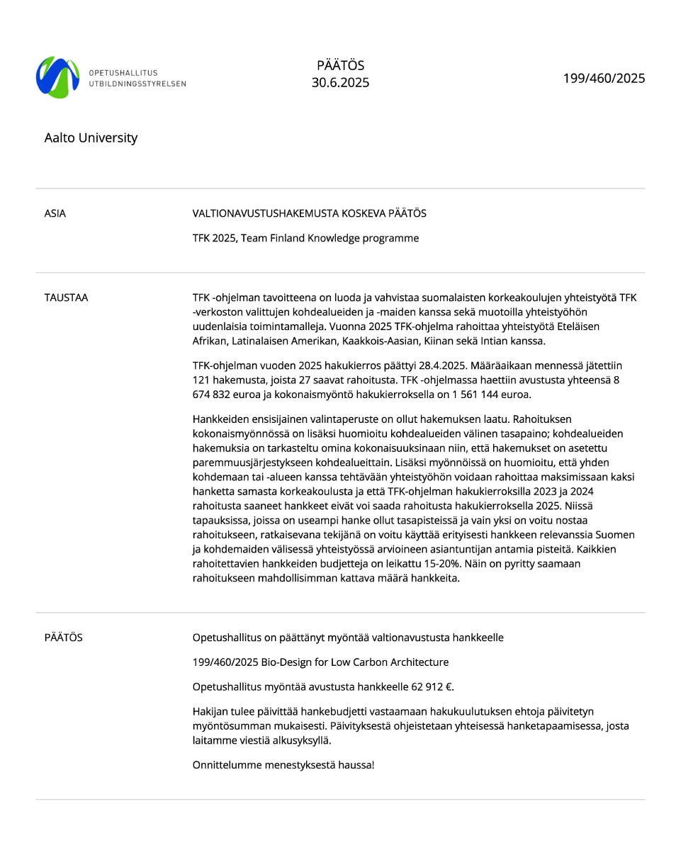 为培养低碳建造与建筑研究领域新兴国际化人才,推动我校与芬兰阿尔托大学在相关学科领域交流互通,芬兰国家教育署批准向该项目拨款62,912 欧元,用于支持两校之间开展教学资源与联合课程开发、师生国际交流、教学方法创新等合作,并通过生物基材料在建筑领域的应用示范,培育学生可持续发展能力。