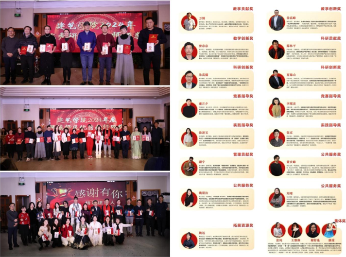 为贯彻全国教育大会精神,进一步加强师德师风建设,鼓励教师落实好立德树人根本任务,cq9试玩 开展了2024年度“精彩建艺人”“优秀师德师风教师”和“优秀研究生导师”评选表彰。19名教职工分别获得教学贡献奖、教学创新奖、科研贡献奖、科研创新奖、竞赛指导奖、实践指导奖、管理贡献奖、公共服务奖、拓展资源奖等9类“精彩建艺人”荣誉称号,19名教职工获得“优秀师德师风教师”荣誉称号,8名教职工获得“优秀研究生导师”荣誉称号。cq9试玩 班子成员为获奖教师颁奖。
