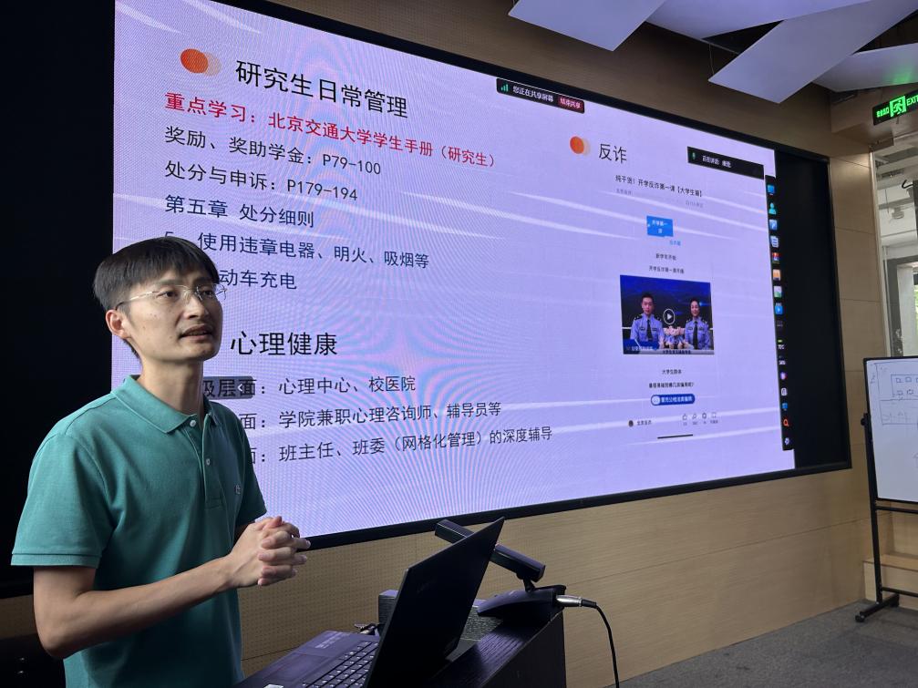 研究生辅导员张帅从思想政治教育及日常管理两方面介绍了《研究生手册》的相关内容。不仅介绍了综合素养实践的考核方式,还关注了安全教育、防诈骗宣传和心理辅导等活动安排,旨在为学生的全面发展和健康成长保驾护航。